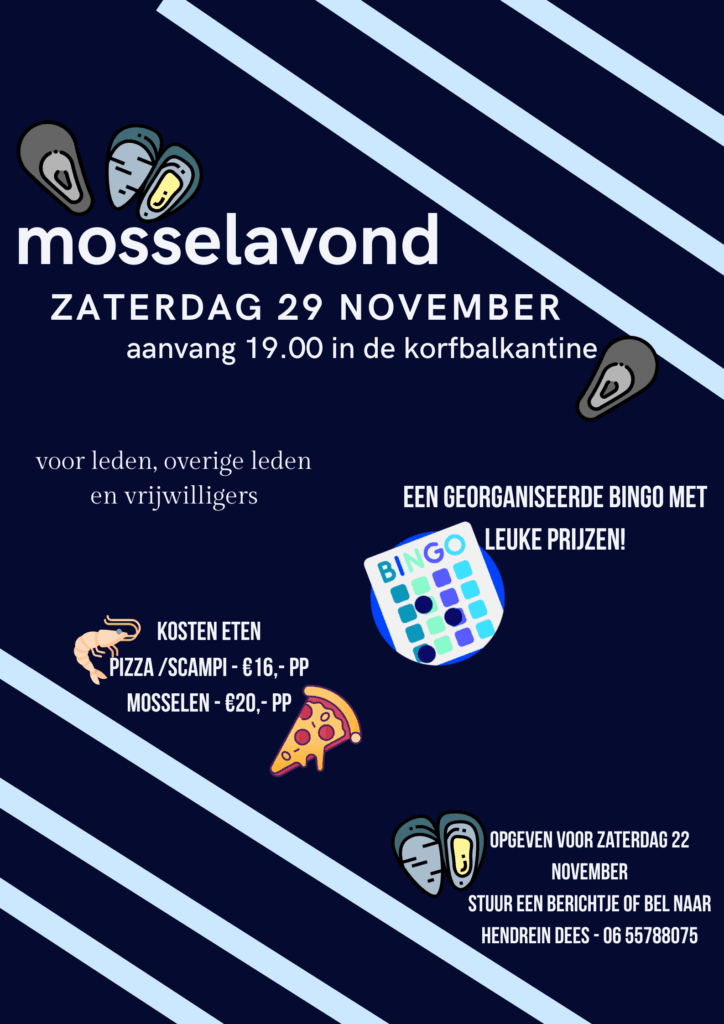 | Mossel avond + bingo | Zaterdag 17 januari | Voor leden, overige leden, en vrijwilligers. |